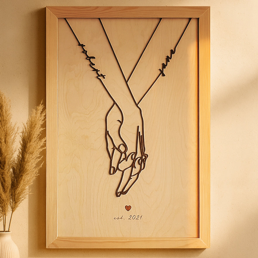 Kompozycje tworzone z dwóch warstw drewna. Pierwsza – z precyzyjnie wyciętym wzorem, druga – z grawerowanym tłem, które nadaje całości głębię i wyjątkowy charakter.